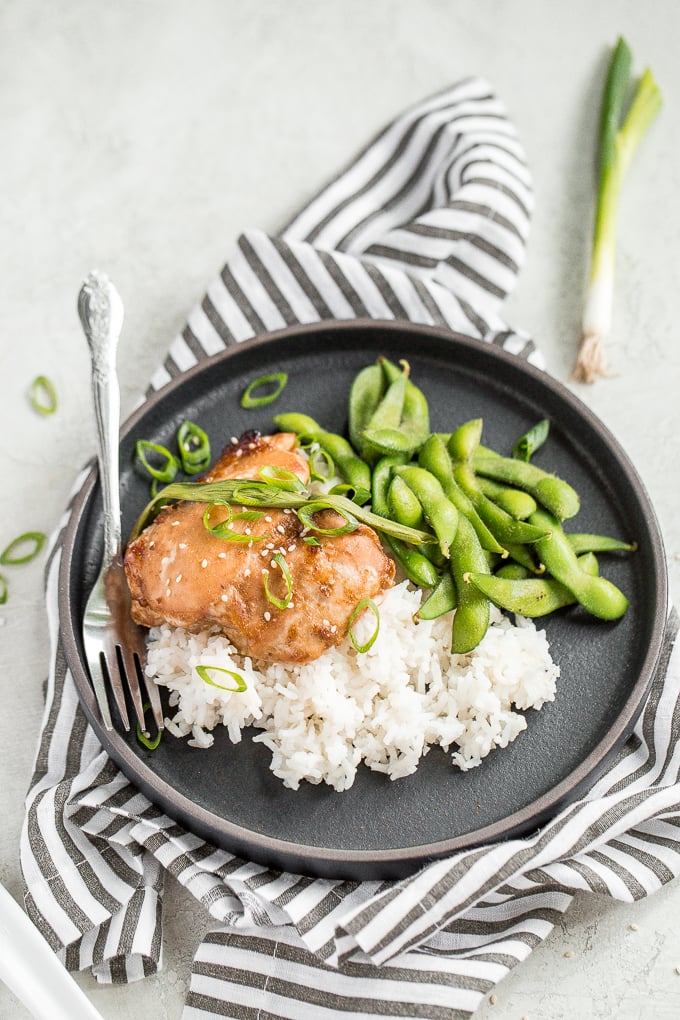 Sheet pan soy-glazed chicken thighs is the perfect weeknight meal -- 30 minutes in the marinade and 20 minutes in the oven. Easier and healthier than take-out. Serve with steamed rice and a vegetable stir fry.
