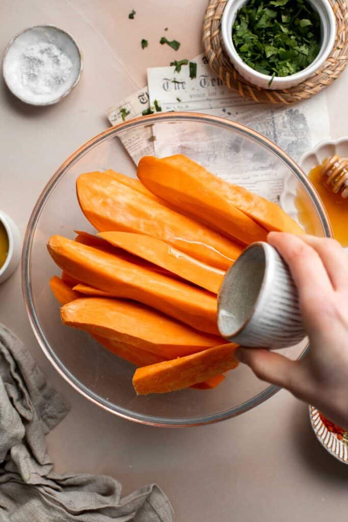- Slice the sweet potatoes in half lengthwise. Cut each half into 3 equal wedges, for a total of 6 wedges per potato.