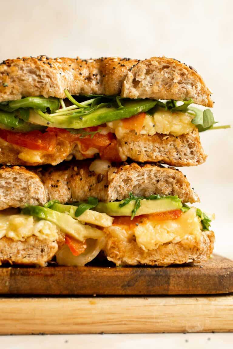 With layers of scrambled eggs, melty cheese, fresh tomato, creamy avocado, and peppery arugula, this Breakfast Bagel is a perfect way to start your day.