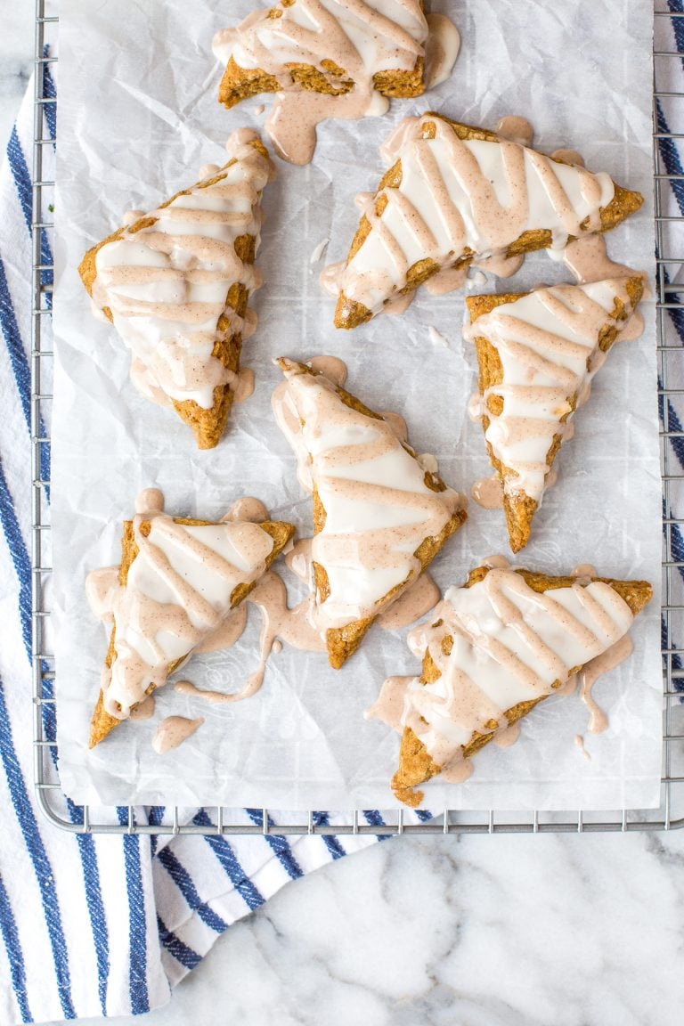 Quick and easy Starbucks inspired mini glazed pumpkin scones are the perfect little fall treat packed with pumpkin flavour and topped with two sweet glazes.
