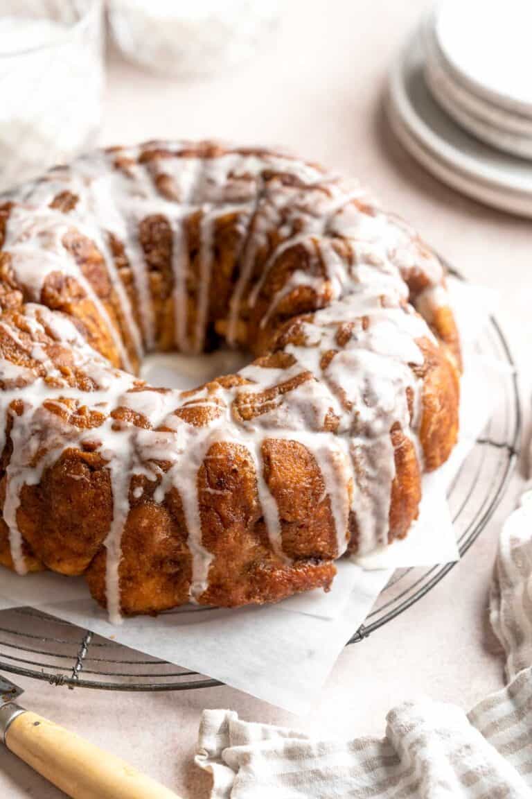 Monkey Bread is a delicious pull apart breakfast pastry made with a super soft dough coated in cinnamon sugar and topped with homemade caramel sauce.