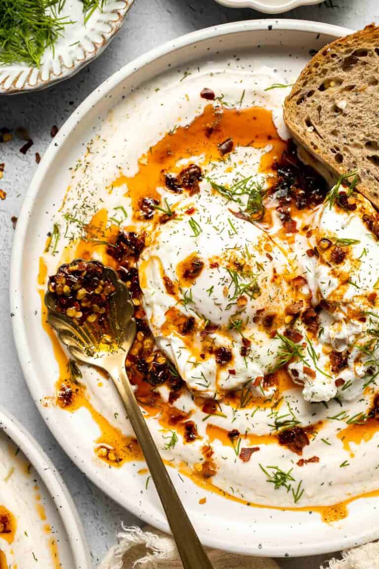 Turkish Eggs, or Çılbır, are a rich and comforting combination of poached eggs nestled over garlicky, herbed yogurt and drizzled with a spiced chili oil.