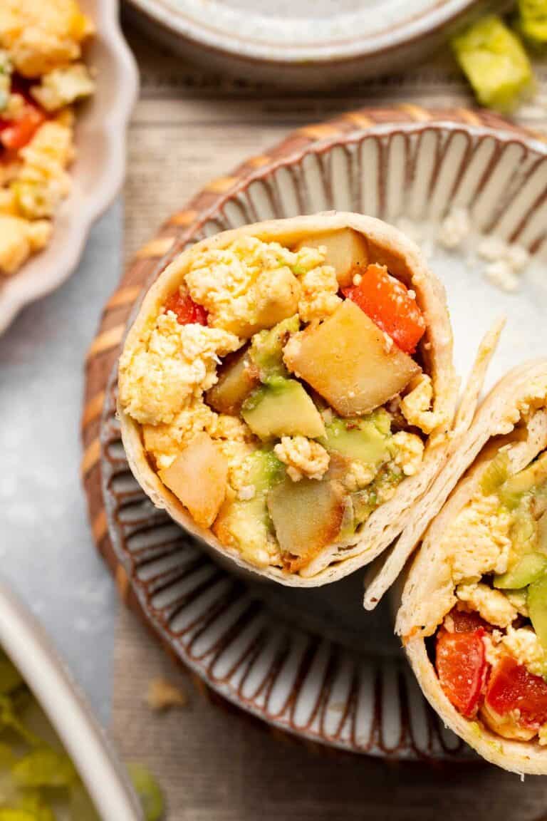 Vegetarian Breakfast Burritos are packed with crispy potatoes, veggies, fluffy eggs, cheese, and avocado. A balanced breakfast that actually keeps you full!