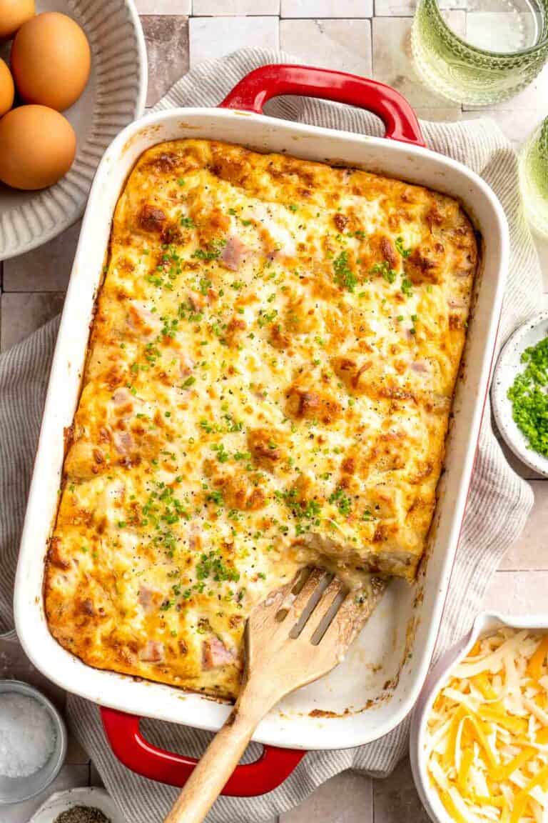This Tater Tot Breakfast Casserole features a savory base of fluffy eggs, melty cheese, and ham, with golden, crispy tater tots that bakes to perfection.