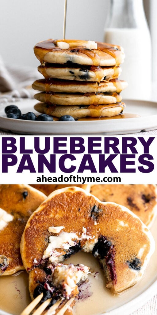 There's nothing better in the morning than soft and fluffy blueberry pancakes. These thick pancakes are loaded with fresh blueberries, topped with butter, and soaked in maple syrup. They are perfect to make for a special brunch on weekends, and leftovers reheat really well which make them the perfect make ahead breakfast on busy mornings. Either way, these delicious blueberry pancakes should be a staple in every home.