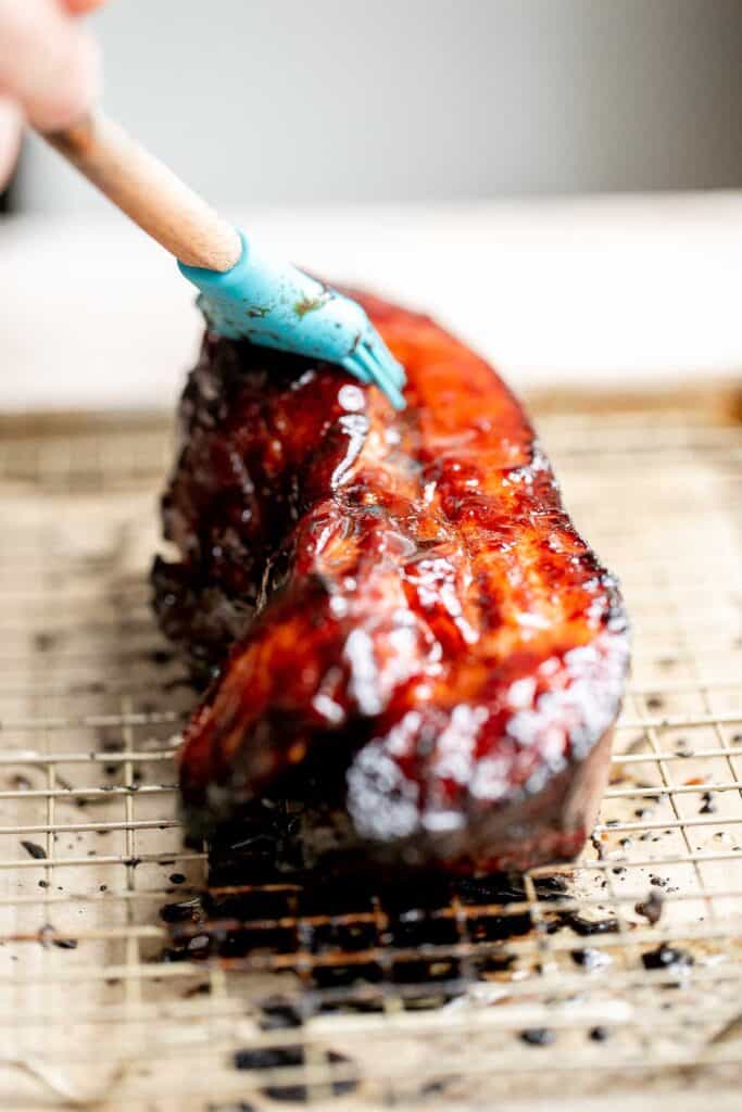 - Remove the pork from the oven and brush evenly with the cooked marinade. Roast for another 5 minutes. The extra marinade adds a beautiful caramelizing glaze on the meat from the browning of sugar during baking.
