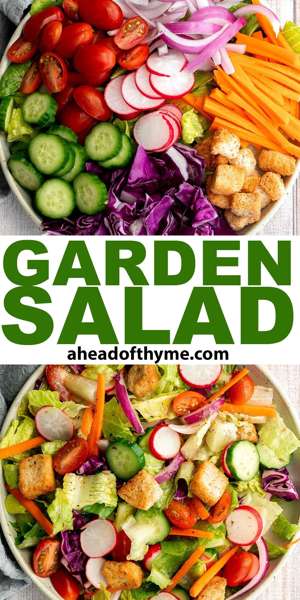 Quick easy homemade garden salad is simple and delicious. Ready in minutes, it's loaded with crisp leafy greens, fresh garden veggies, and crunchy croutons.