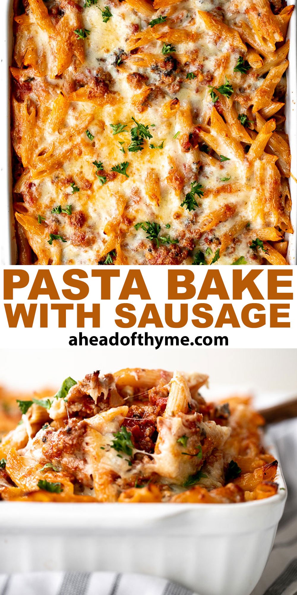Pasta bake with sausage (baked ziti) is basically a lazy day lasagna with layers of pasta tossed in a rich tomato meat sauce packed with Italian sausage, layered with lots of gooey golden mozzarella cheese, and baked to perfection. It's an easy and delicious casserole dinner to make any day of the week. Plus, you can even make it ahead and freeze for another day.