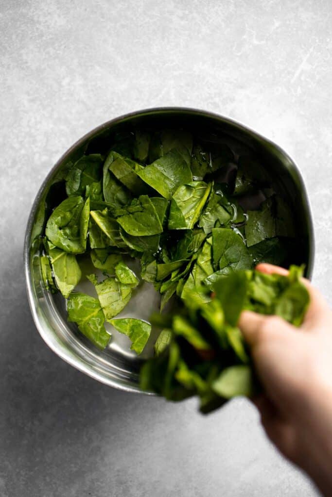 Although blanching the spinach in boiling water is entirely optional, there are several key reasons for this extra step that make it worth it. First, blanching will help reduce the concentration of oxalates, which can contribute to health issues for certain individuals. You'll also be able to remove any excess moisture that may make this recipe taste soggy or overcooked. Blanching also speeds up the sauteeing process while preserving the dark green color.