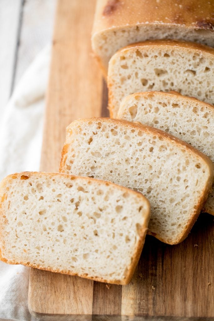 Sourdough sandwich bread is chewy with the perfect air holes inside, and has a crispy crust. It has a delicious signature sourdough taste. Like most sourdough bread, this bread takes just 10 minutes of actual prep work and no kneading. Although it does take longer for sourdough to rise versus traditional yeast, but it is easy to plan ahead and incorporate into your schedule.