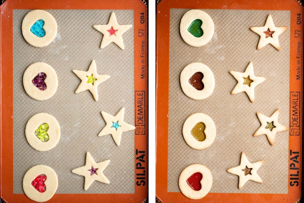- Add the stained glass center. Sprinkle crushed candies into the cut out center of the cookies, filling them ¾ full. If you fill them too much, the candy will melt out of the window and onto the cookies.