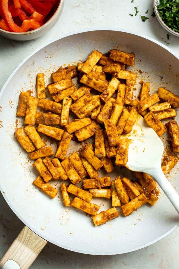 - Sauté tofu. Heat oil in a large skillet until the hot oil sizzles, about 2 minutes. Add tofu and sauté until browned on all sides, about 5-7 minutes.